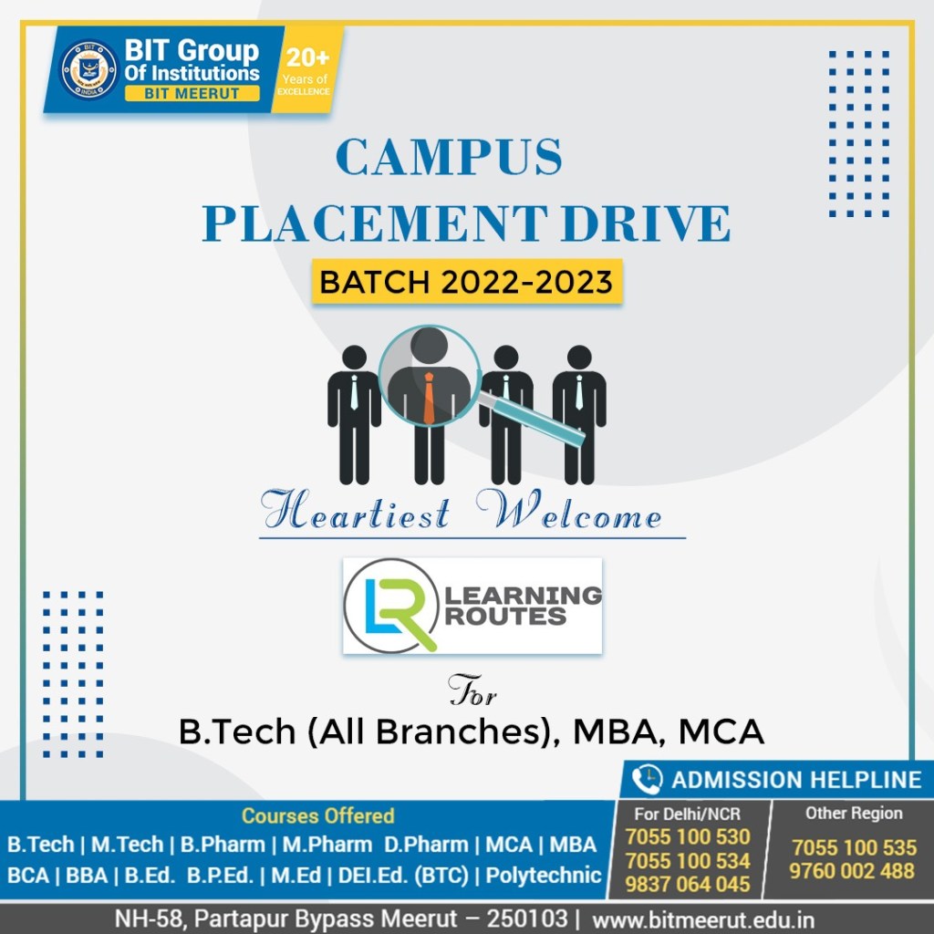 BIT Meerut is one of the top engineering and MCA program, as it provides 100% placement assistance to students. Many global companies visit the university’s annual job drive to find talented and skilled professionals. Students receive a balanced education through focused classroom learning, laboratory work, workshops, seminars, intercollegiate competitions, guest lectures and industry visits.