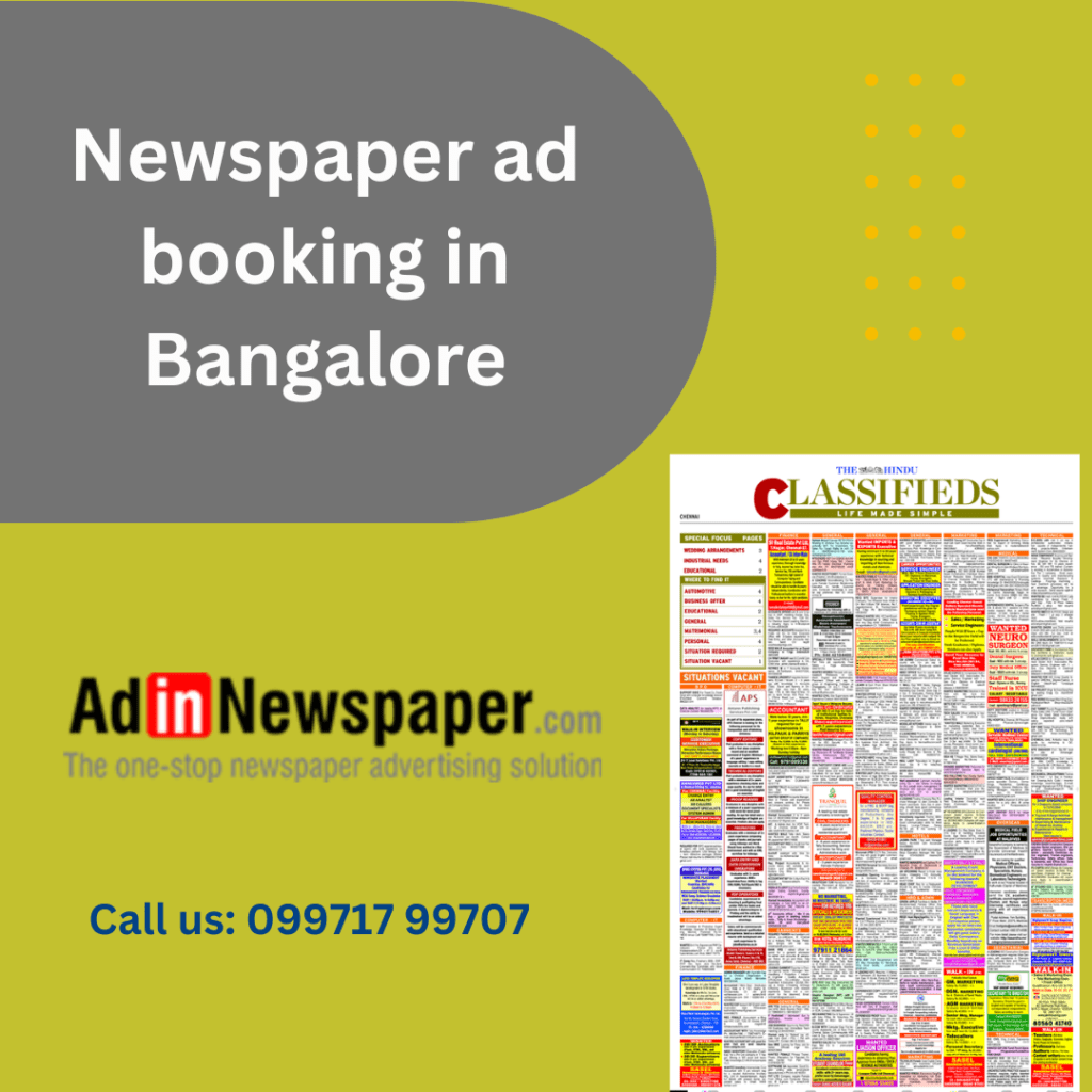 When considering newspaper ad booking in Bangalore, it is important to research and select the right newspaper that aligns with your target audience and marketing goals. Each newspaper has its own readership profile, circulation figures, and advertising rates, so it’s crucial to choose the one that best suits your needs. Additionally, newspapers often have specific guidelines and deadlines for ad booking, so make sure to plan your advertising campaign accordingly.